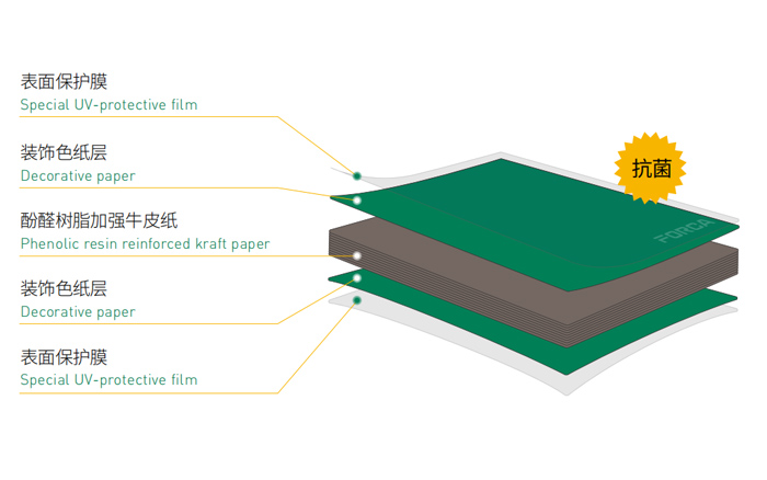 福爾卡·抗倍特板(纖維樹(shù)脂板)是由裝飾色紙含浸三聚氰胺樹(shù)脂,加上多層黑色或褐色牛皮紙含浸酚醛樹(shù)脂層疊后,再用鋼板經(jīng)由高溫(150° C)高壓(1430psi)的環(huán)境壓制而成,產(chǎn)品密度不低于 1450KG/m',厚度從 1.5mm 到 25mm 皆可制作。酚醛樹(shù)脂纖維板依其表面色紙層,可滿足多種花色選擇,單面或雙面的裝飾需求。